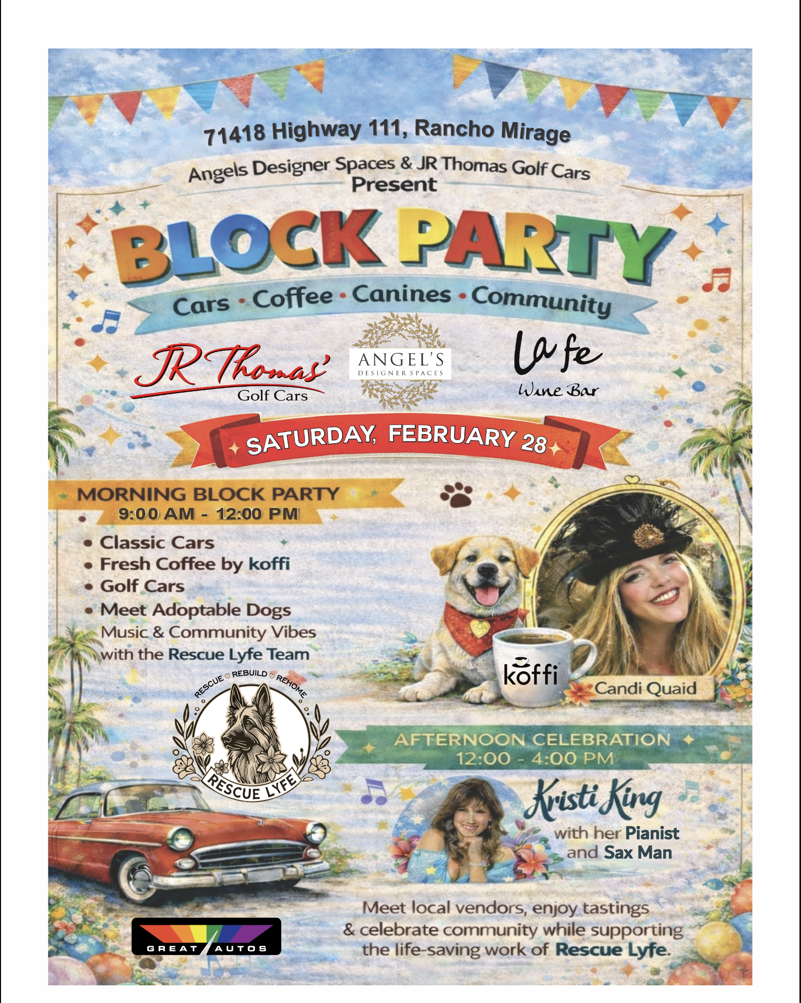 THE BUSINESSES BY KOFFI HAVE INVITED GREAT AUTOS TO SHOW OFF OUR CARS FOR THEIR BLOCK PARTY, SEE FLYER. THEY WILL HAVE COFFEE, SNACKS, AND ADORABLE DOGS FOR ADOPTION.
